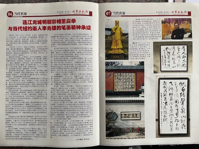 张天谈先生与李兆银先生的友谊始于十余年前,二人因对中华传统文化的共同热爱而相知。张天谈先生曾深入调研李兆银先生的艺术历程,撰写《连江琯头龙城明朝宗相董应举与当代纽约墨人李兆银的笔墨精神承续》一文,将李兆银的书法成就与明代大儒董应举的文人精神相联系,在海外华人圈引发广泛反响。文中特别提到李兆银先生"数十年临池不辍,以魏碑为骨、行草为韵,融中西审美于毫端”的艺术追求并获“世界书法艺术大师”的称号。以及李兆银先生任美国中国书法家协会主席对中美书法的传播做出的巨大贡献,盛赞其作品“龙翔凤舞千峰翠,笔走云天气自巍”。以书载道 架设中美文化桥梁。